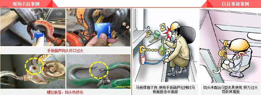 2、工人沒有配合G型夾具使用導致葫蘆受力過大、馬板焊接不良時依然蠻拉硬拽使馬板崩脫擊中面部等不良現象在作業現場時有發生。